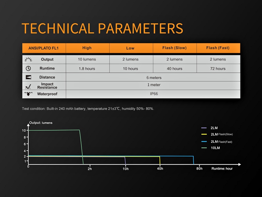 | Output/Runtime | High: 10 Lumens, (1 hrs 48 mins), Low: 2 Lumens, (10 hrs), Flash (Slow): 2 Lumens, (40 hrs), Flash (Fast): 2 Lumens, (72 hrs) |