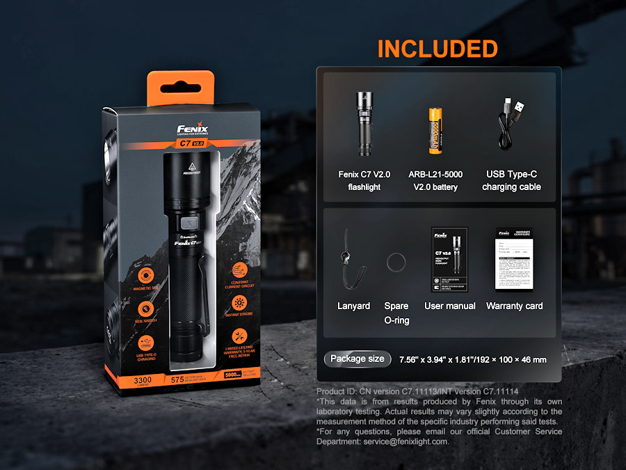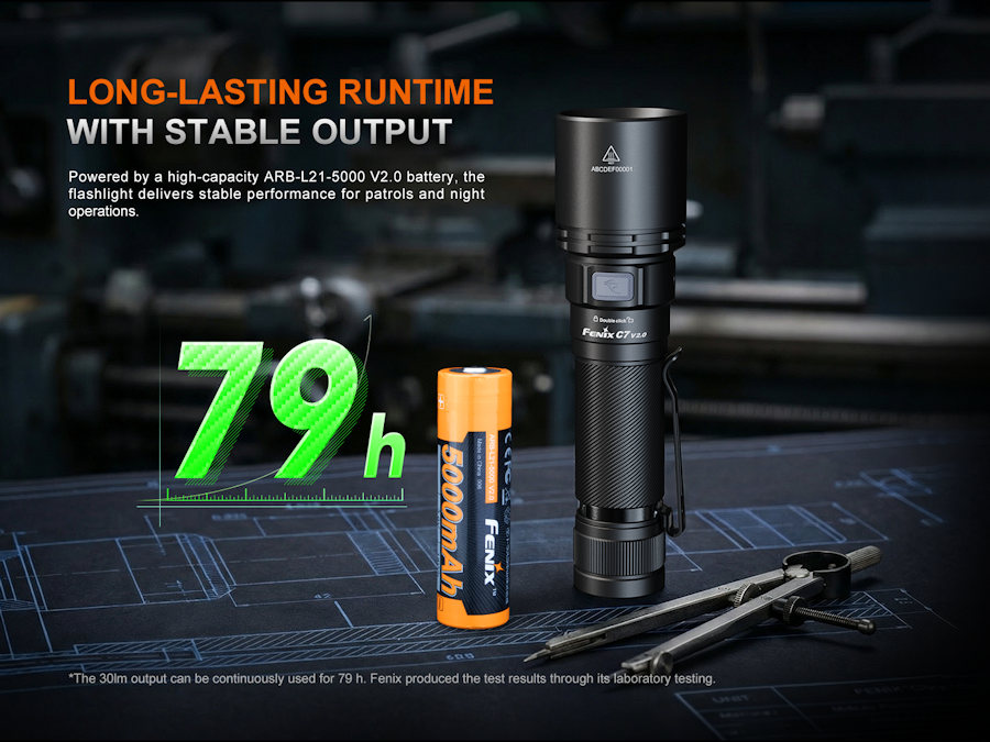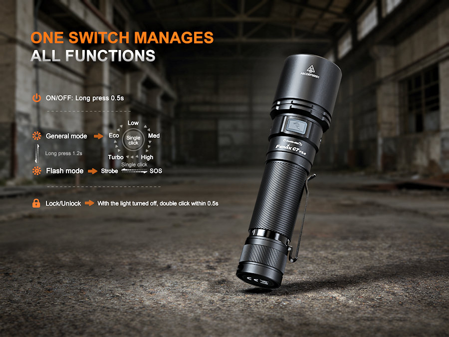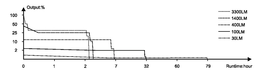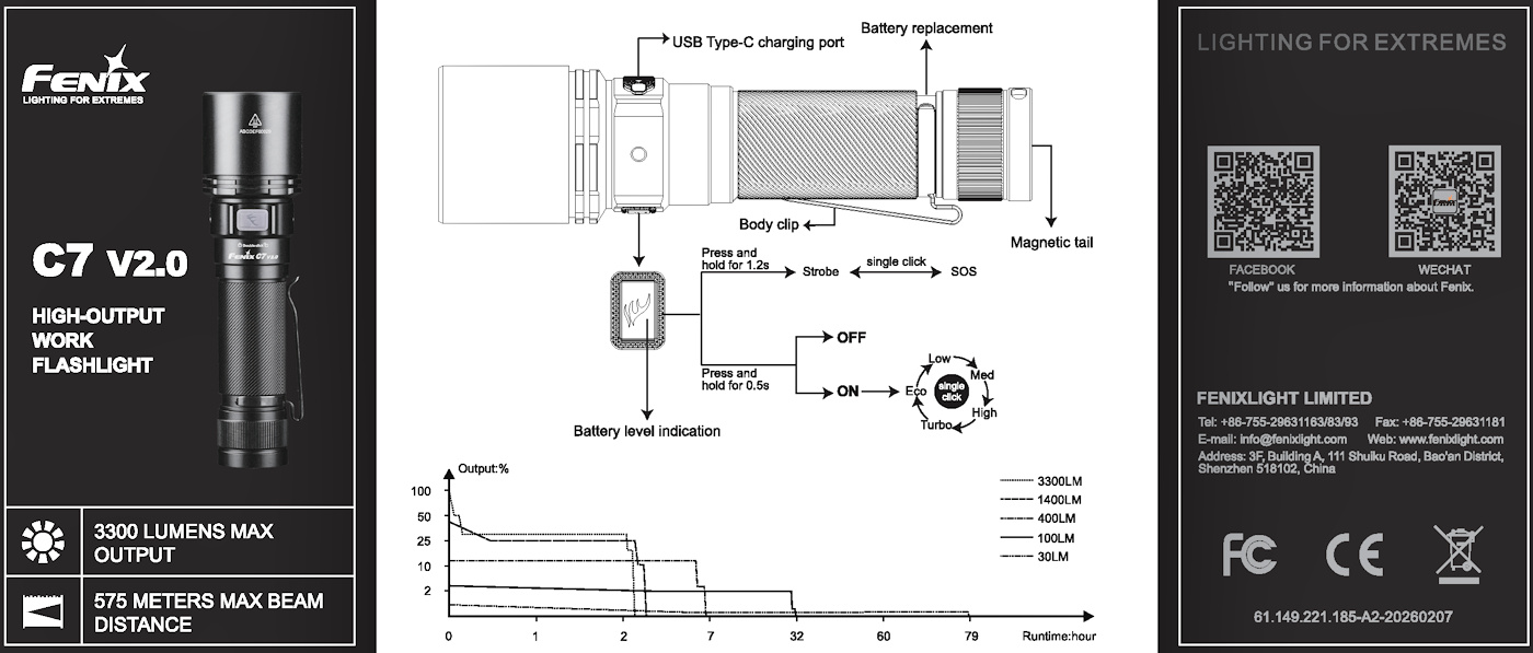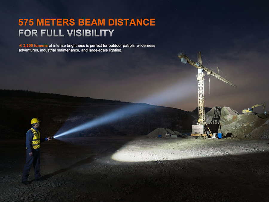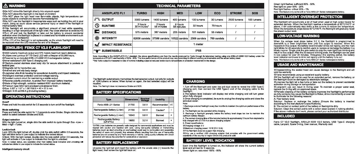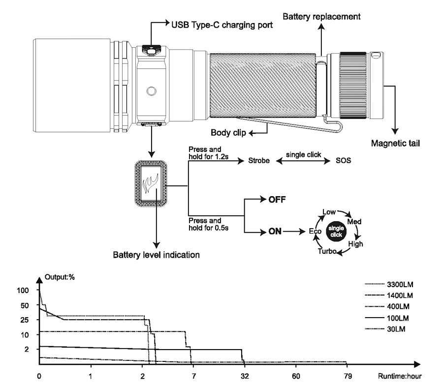 | Output/Runtime | Turbo: 3300 Lumens, (2 hrs 30 mins), High: 1400 Lumens (2 hrs 58 mins), Med: 400 Lumens (6 hrs 58 min), Low: 100 Lumens (32 hrs), Eco: 30 lumens (79 hrs), Strobe: 2500 Lumens, SOS 100 Lumens, |