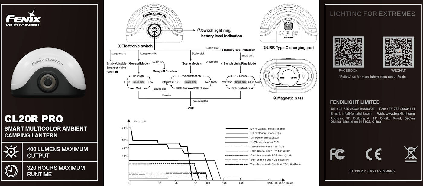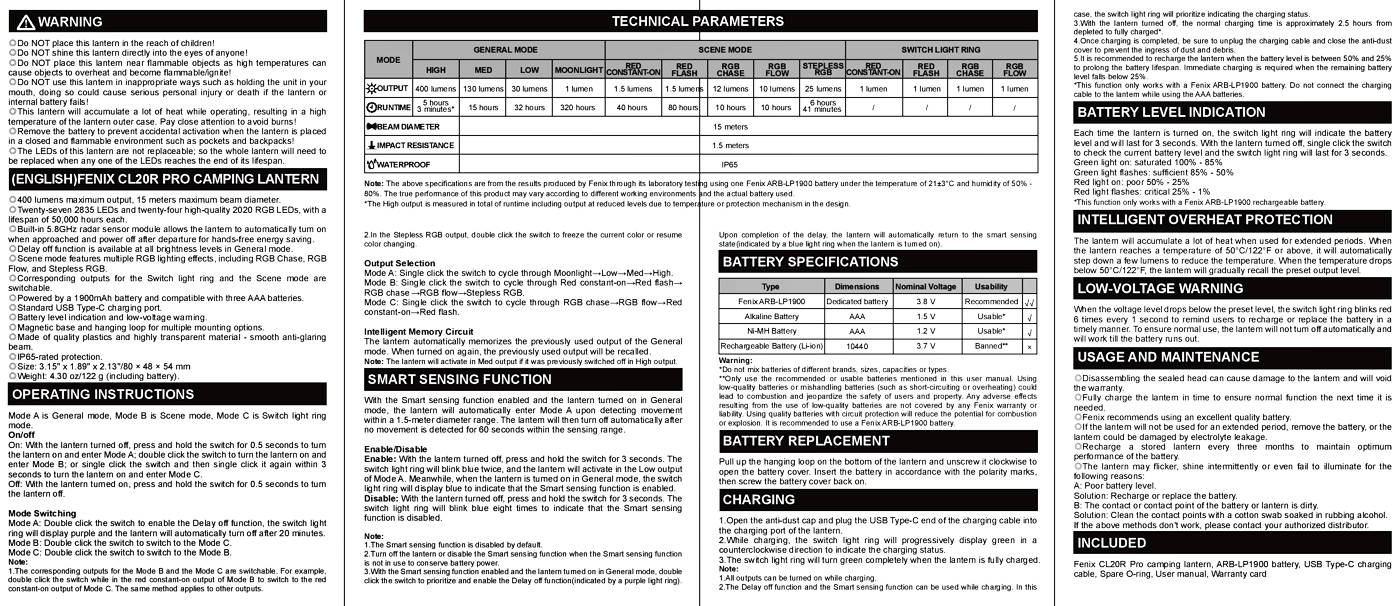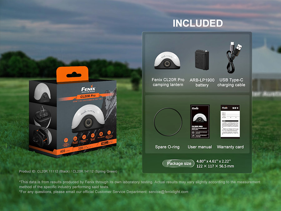 Retail Packaged CL20R Pro lantern Fenix ARB-LP-1900 battery USB-C Charging Cable Spare O-ring User manual Warranty Card