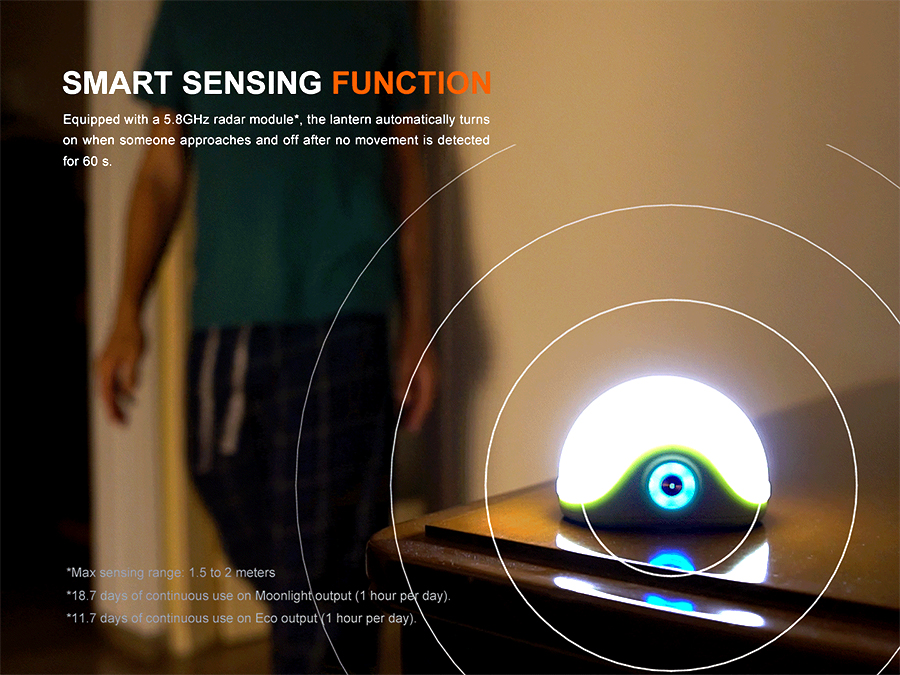 With the Smart sensing function enabled and the lantern turned on in General mode, the lantern will automatically enter Mode A upon detecting movement within a 1.5-metre diameter range. The lantern will then turn off automatically after no movement is detected for 60 seconds within the sensing range.