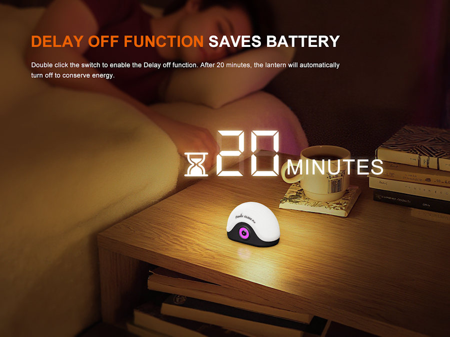 Mode A: Double click the switch to enable the Delay off function, the switch light ring will display purple and the lantern will automatically turn off after 20 minutes. Mode B: Double click the switch to switch to Mode C. Mode C: Double click the switch to switch to Mode B.