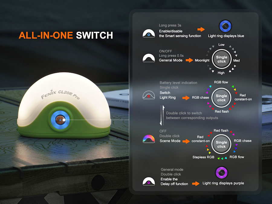 With the lantern turned off, press and hold the switch for 3 seconds. The switch light ring will blink blue twice, and the lantern will activate in the Low output of Mode A. Meanwhile, when the lantern is turned on in General mode, the switch light ring will display blue to indicate that the Smart sensing function is enabled.