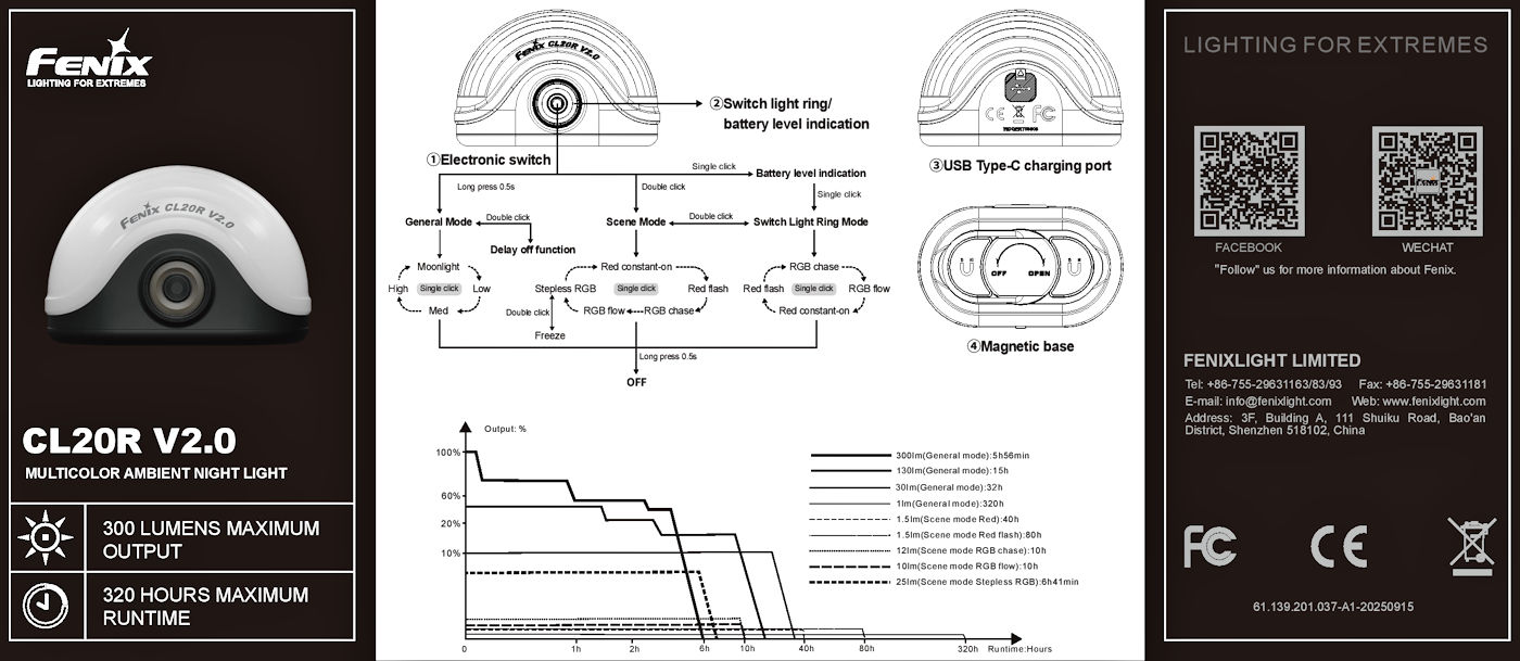 Designed as a premium light source and a fun light to create a party atmosphere or keep the kids entertained, CL20R V2.0 is controlled by a single switch and offers 4 white light levels of 1, 30, 130 and 300 lumens, red and red flashing modes, plus multi colour RGB chase, flow and stepless colour modes. There's also a delay-off function that can be set to switch the light off after 20 minutes in white light mode.