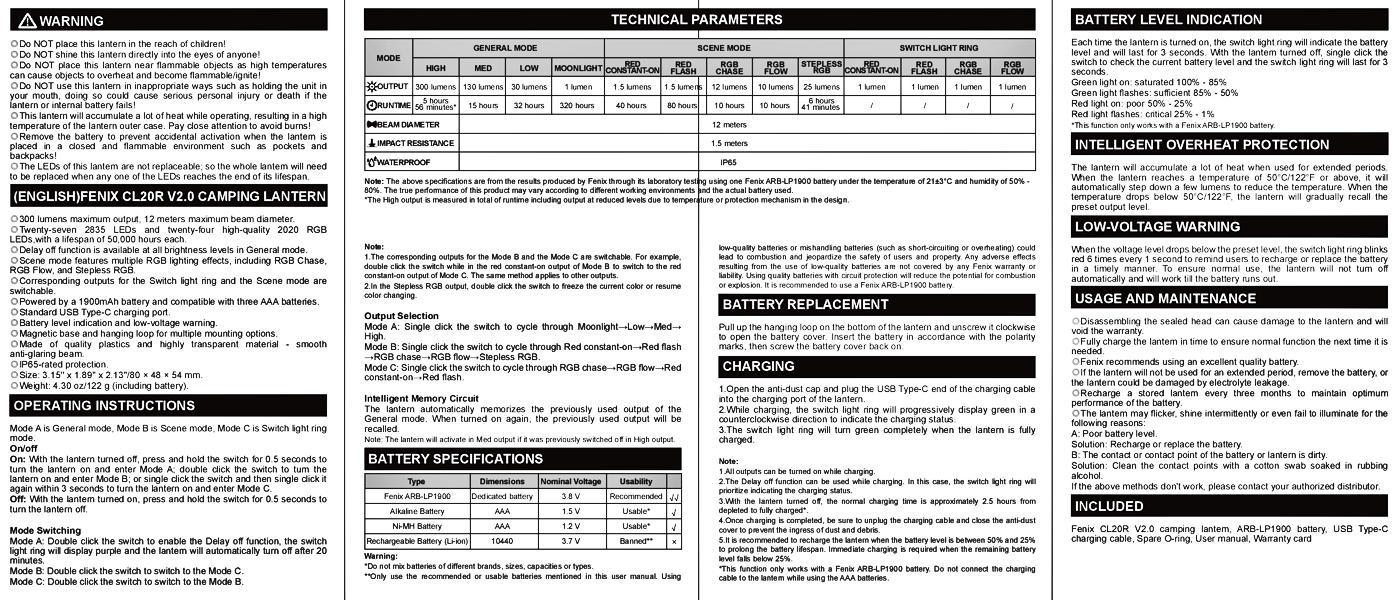 The lantern is powered by a removable/replaceable Fenix ARB-LP1900 Li-ion battery, and can also use 3 x AAA batteries as a back-up power source. The supplied battery is recharged via an internally waterproofed USB-C socket (cable supplied).