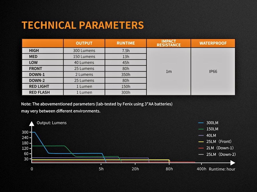 | Output/Runtime | High: 300 Lumens (7 hrs 30 mins), Med: 150 Lumens (13 hrs), Low: 40 Lumens (45 hrs) Front: 25 Lumens (80 hrs), Down I: 2 Lumens (350 hrs), Down II: 25 Lumens (80 hrs) Red light: 1 Lumen (150 hrs), Red flash: 1 Lumen (300 hrs) |