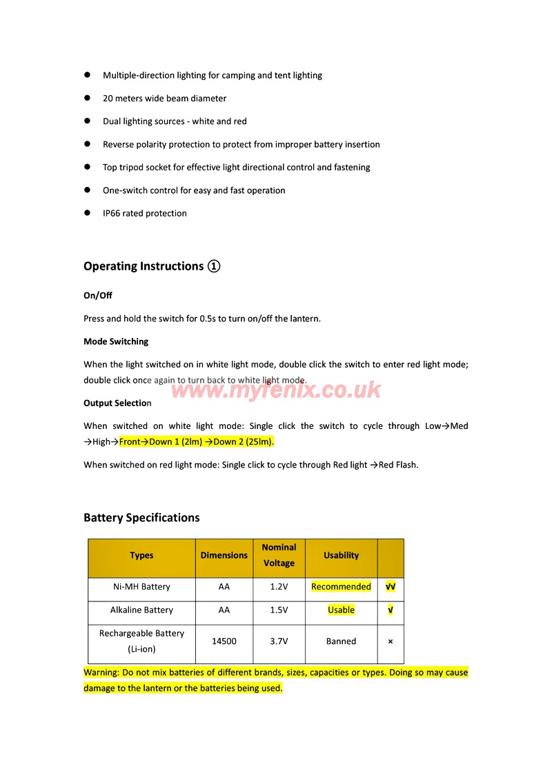 | Additional Battery Type | 3 x AA NimH (Do not use 14500 Li-ion 3.7v) |