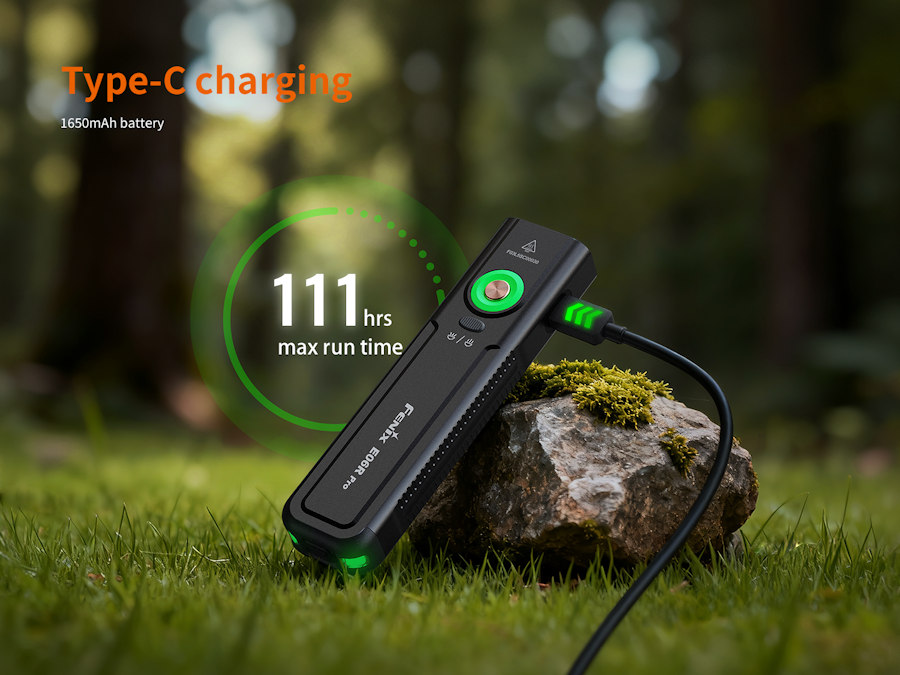 The built-in 1650mAh Li-po battery is recharged via a waterproof USB-C socket and delivers up to 111 hours of run time in Eco mode.