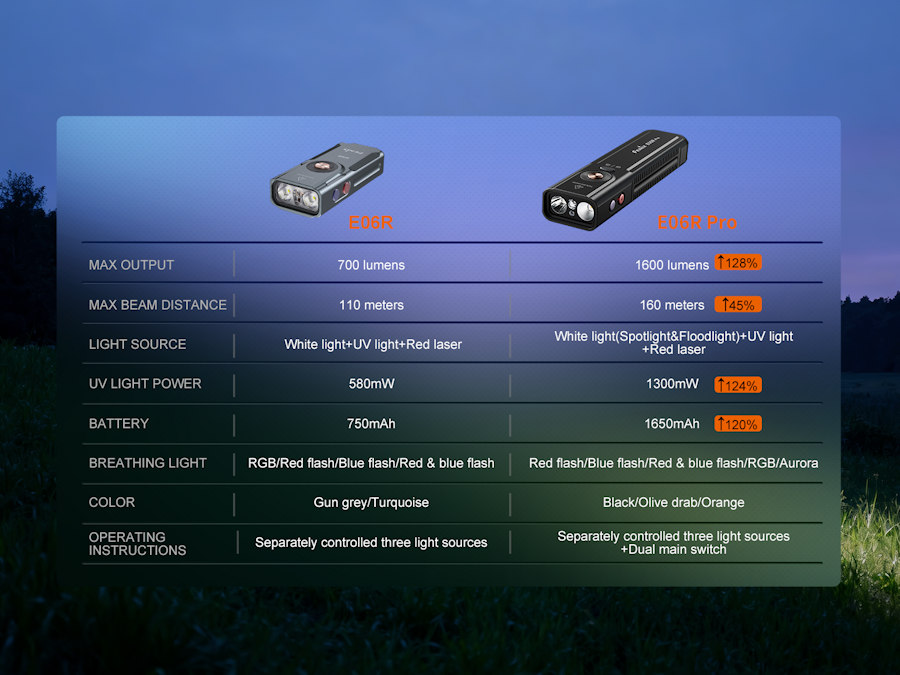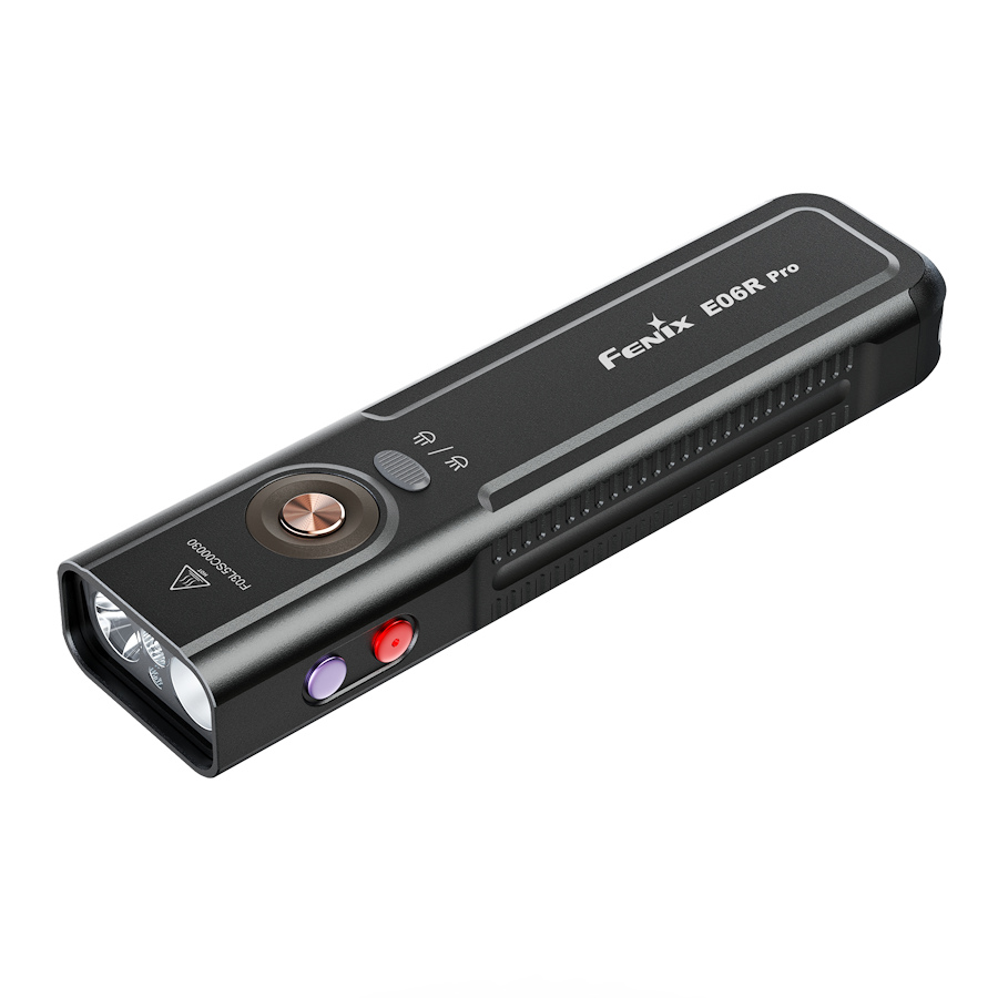 Fenix E06R Pro is a high performance pocket size torch with multiple light sources, including a powerful spotlight, floodlight, 365nm UV LED, red laser and multi colour ring light. With its compact size, powerful 1600 lumen lighting and a beam range in excess of 160 metres, this tough companion is ideal for every day carry, professional use and outdoor adventures.