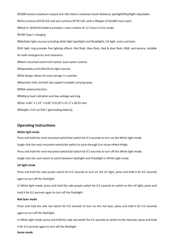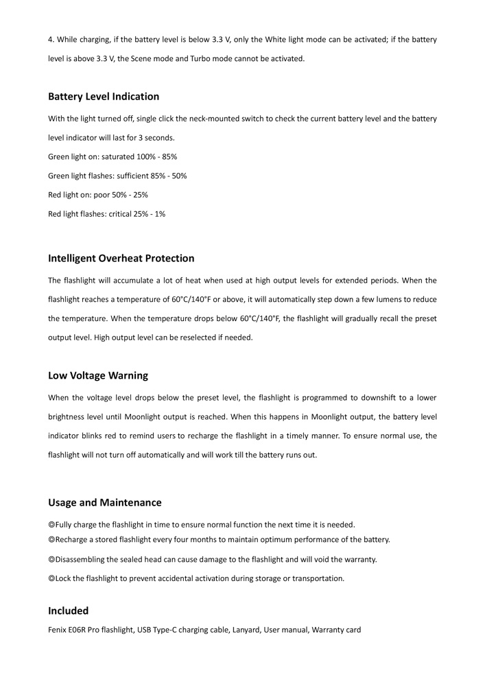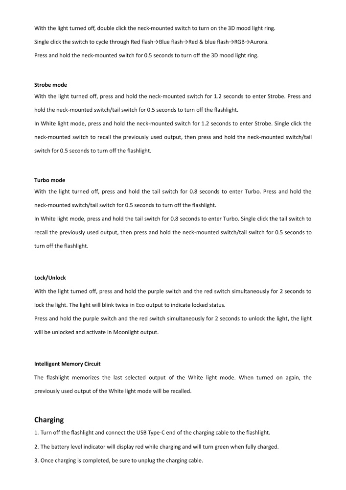 1. Turn off the flashlight and connect the USB Type-C end of the charging cable to the flashlight. 2. The battery level indicator will display red while charging and will turn green when fully charged. 3. Once charging is completed, be sure to unplug the charging cable. 4. While charging, if the battery level is below 3.3 V, only the White light mode can be activated; if the battery level is above 3.3 V, the Scene mode and Turbo mode cannot be activated.