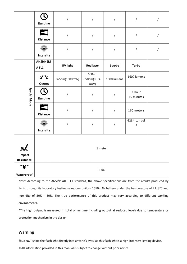 ◎Do NOT shine the flashlight directly into anyone’s eyes, as this flashlight is a high-intensity lighting device. ◎All information provided in this manual is subject to change without prior notice. ◎Do NOT place this flashlight in the reach of children! ◎Do NOT place light head near flammable objects, high temperatures can cause objects to overheat and become flammable/ignite! ◎Do NOT use the flashlight in inappropriate ways such as holding the unit in your mouth, doing so could cause serious personal injury or death if the flashlight or internal battery fails! ◎This flashlight will accumulate a significant amount of heat while operating, resulting in a high temperature of the light shell. Pay close attention to avoid burns. ◎Lock the flashlight to prevent accidental activation when the flashlight is placed in a closed and flammable environment such as pockets and backpacks! ◎The LEDs of this flashlight are not replaceable; so the whole flashlight will need to be replaced when any one of the LEDs reaches the end of its lifespan. ◎This flashlight is for professional use only. Not for use by untrained individuals or children. ◎This flashlight complies with the EU photobiological safety standard EN 62471. Please use this flashlight according to the specified safety classification.