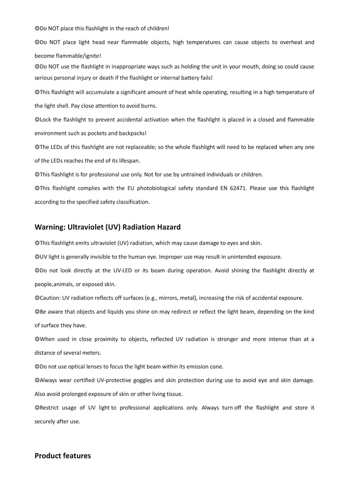 â—ŽThis flashlight emits ultraviolet (UV) radiation, which may cause damage to eyes and skin. â—ŽUV light is generally invisible to the human eye. Improper use may result in unintended exposure. â—ŽDo not look directly at the UV-LED or its beam during operation. Avoid shining the flashlight directly at people,animals, or exposed skin. â—ŽCaution: UV radiation reflects off surfaces (e.g., mirrors, metal), increasing the risk of accidental exposure. â—ŽBe aware that objects and liquids you shine on may redirect or reflect the light beam, depending on the kind of surface they have. â—ŽWhen used in close proximity to objects, reflected UV radiation is stronger and more intense than at a distance of several meters. â—ŽDo not use optical lenses to focus the light beam within its emission cone. â—ŽAlways wear certified UV-protective goggles and skin protection during use to avoid eye and skin damage. Also avoid prolonged exposure of skin or other living tissue. â—ŽRestrict usage of UV light to professional applications only. Always turn off the flashlight and store it securely after use.
