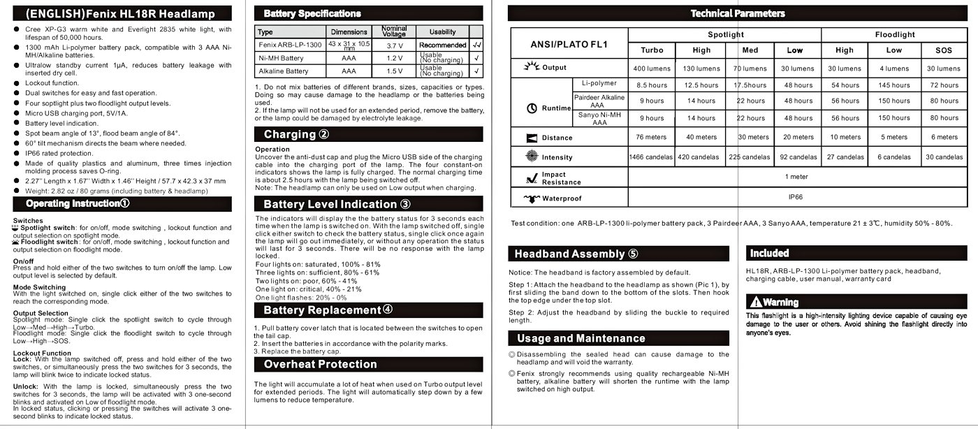 | Output/Runtime | Spotlight Mode - Turbo: 400 Lumens, (8 hrs 30 mins), High: 130 Lumens, (12 hrs 30 mins), Med: 70 Lumens, (17 hrs 30 mins), Low: 30 Lumens, (48 hrs) Floodlight Mode - High: 30 Lumens, (54 hrs), Low: 4 Lumens (145 hrs), SOS: 30 Lumens (72 hrs) |