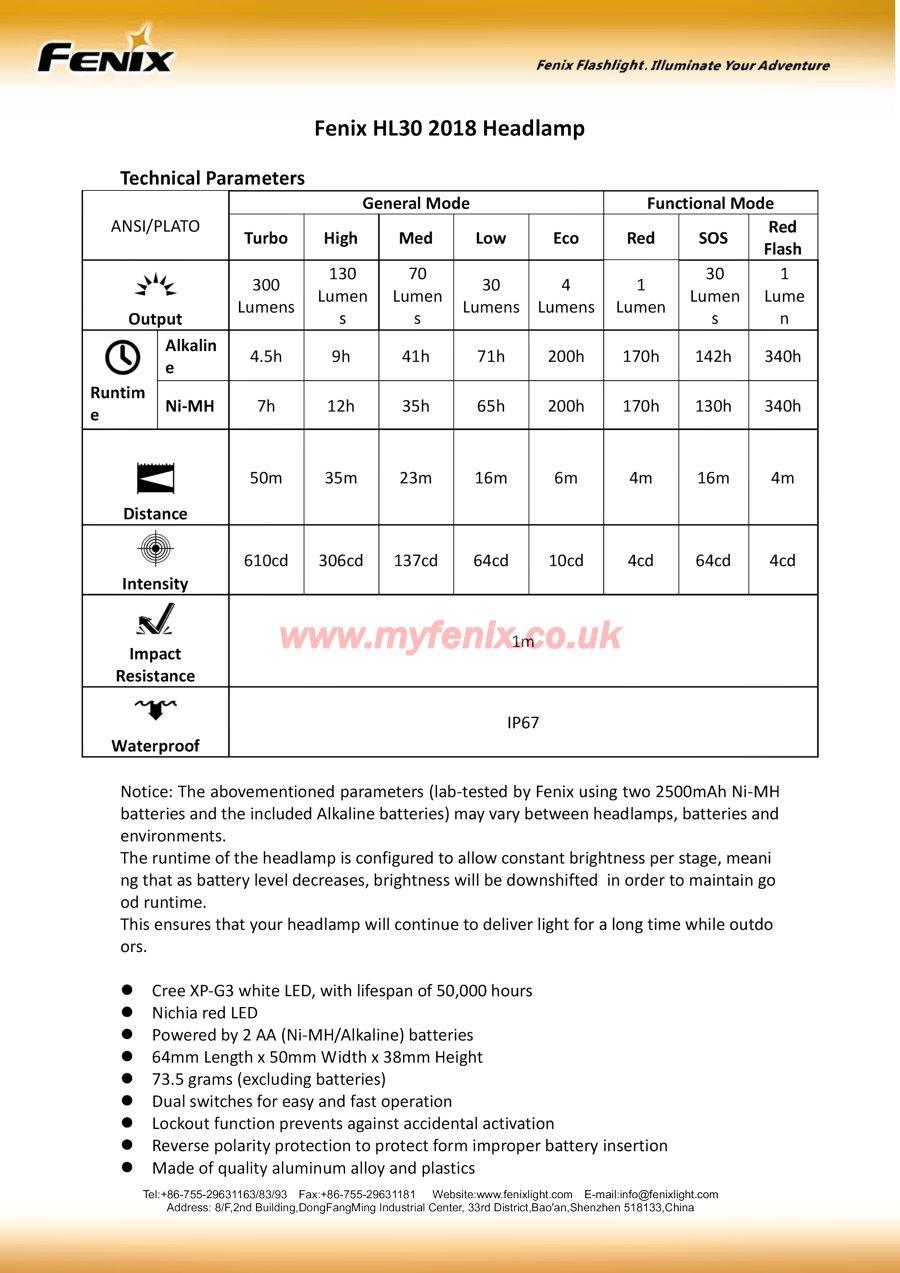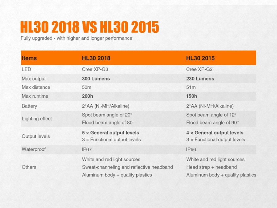 | Output/Runtime | Turbo: 300 lumens (7 hrs), High: 130 lumens (12 hrs), Mid: 70 lumens (35 hrs), Low: 30 lumens (65 hrs), Eco: 4 lumens (200 hrs), Red: 1 lumen (170 hrs), SOS: 30 lumens (130 hrs), Red Flash: 1 lumen (340 hrs). (Using 2 x 2500 NiMH batteries) |