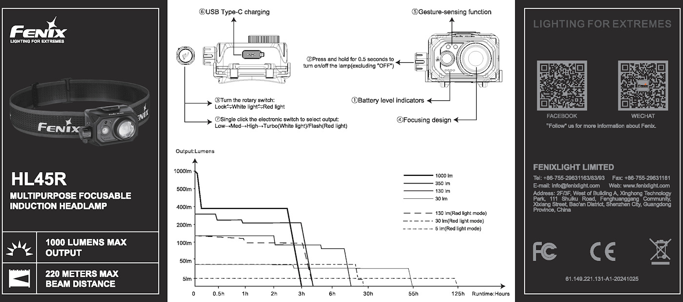 Retail Packaged Fenix HL45R Rechargeable Focusing Headlamp ARB-LP1900 mAh Li-Poly battery USB A to C charger cable User Manual Warranty Card