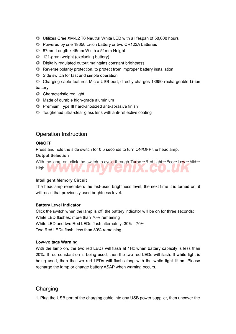 HL60R outputs up to a searing 950 lumens and is supplied with a Fenix 2600 mAh rechargeable 18650 battery plus micro USB charging cable enabling the use of any USB power outlet to charge the headlamp (mobile phone charger / computer etc). The battery charges from empty in approx 4 hours and is removable for replacement with a charged spare or higher capacity battery. HL60R can also be powered by 2 x CR123A lithium batteries.