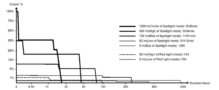 The headlamp automatically memorizes the previously used output level excluding Red light mode. When turned on again, the previously used output level will be recalled.