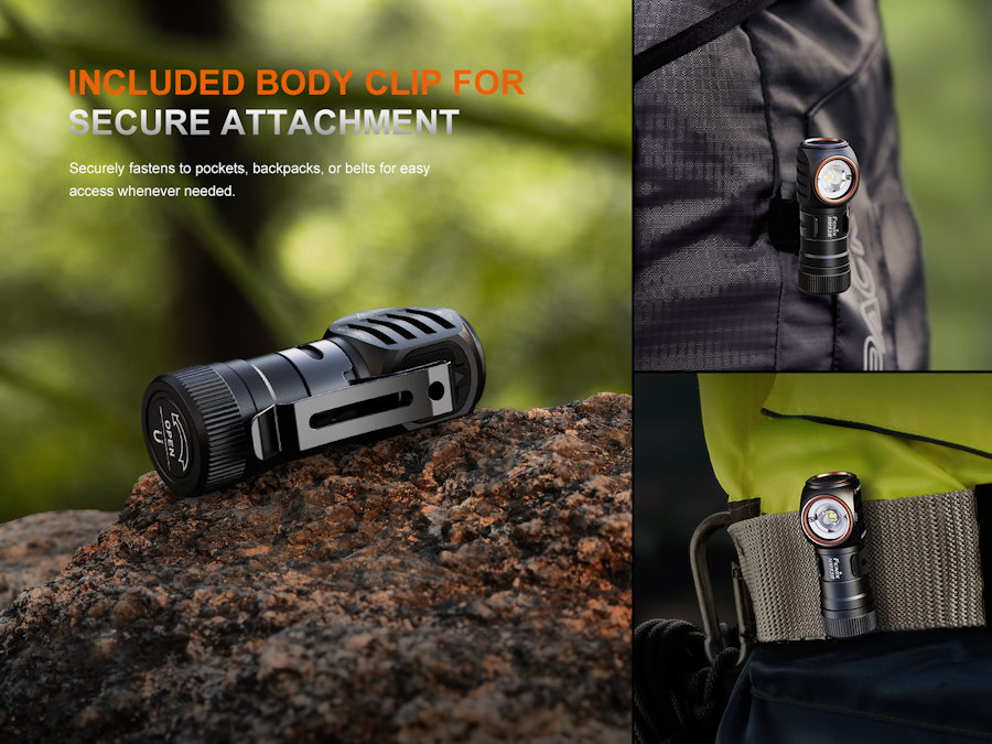 • Headlamp mount, body clip, and magnetic tail-cap provide multiple mounting options.