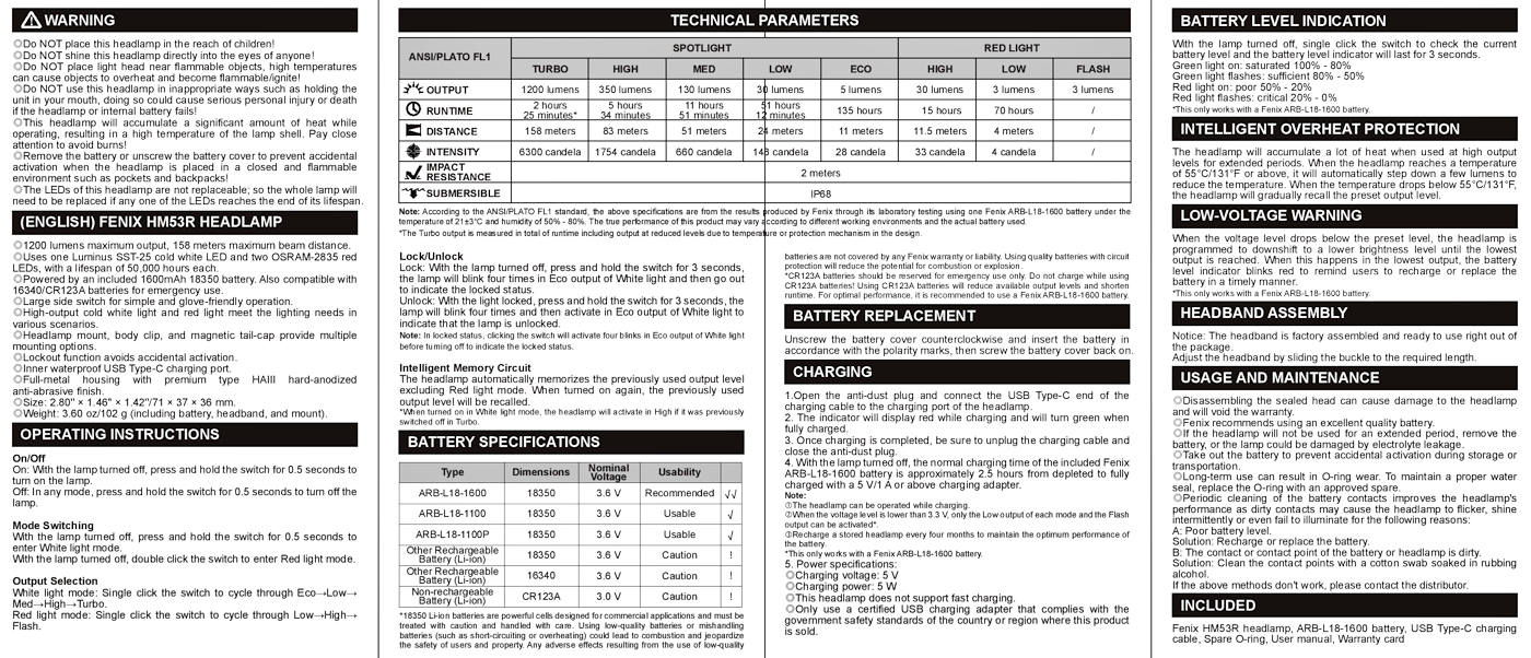 1. The headlamp can be operated while charging. 2. When the voltage level is lower than 3.3 V, only the Low output of each mode and the Flash output can be activated. Note: This only works with a Fenix ARB-L18-1600 battery. 3. Recharge a stored headlamp every four months to maintain the optimum performance of the battery.