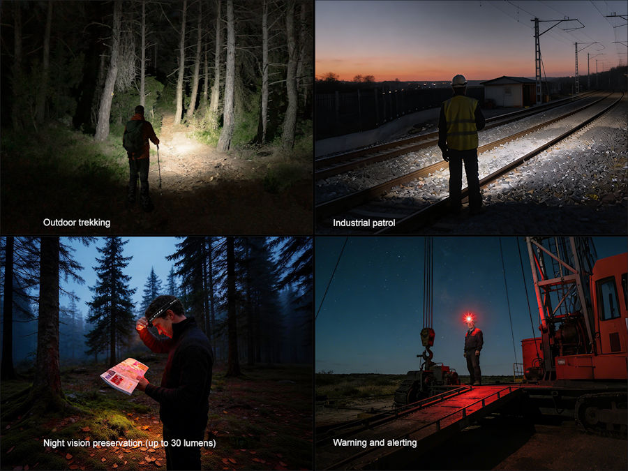 When the voltage level drops below the preset level, the headlamp is programmed to downshift to a lower brightness level until the lowest output is reached. When this happens in the lowest output, the battery level indicator blinks red to remind users to recharge or replace the battery in a timely manner.