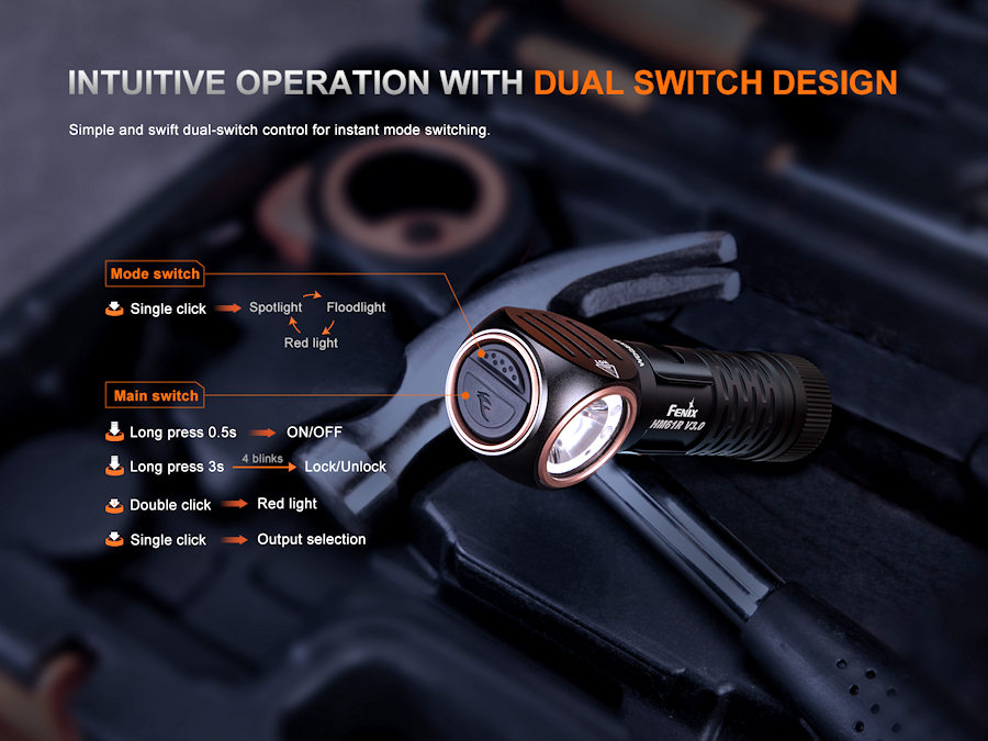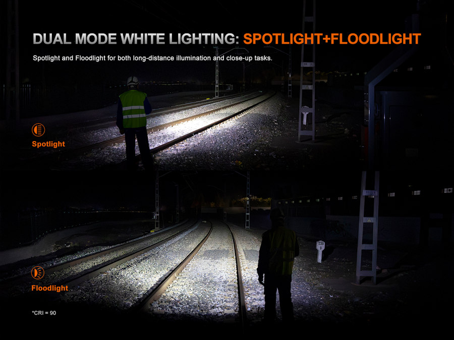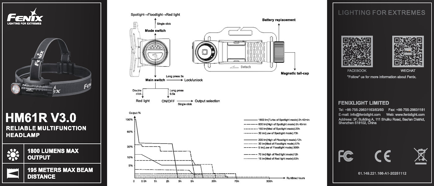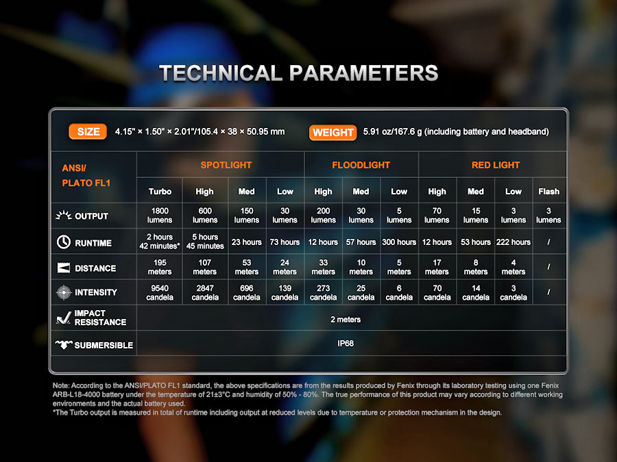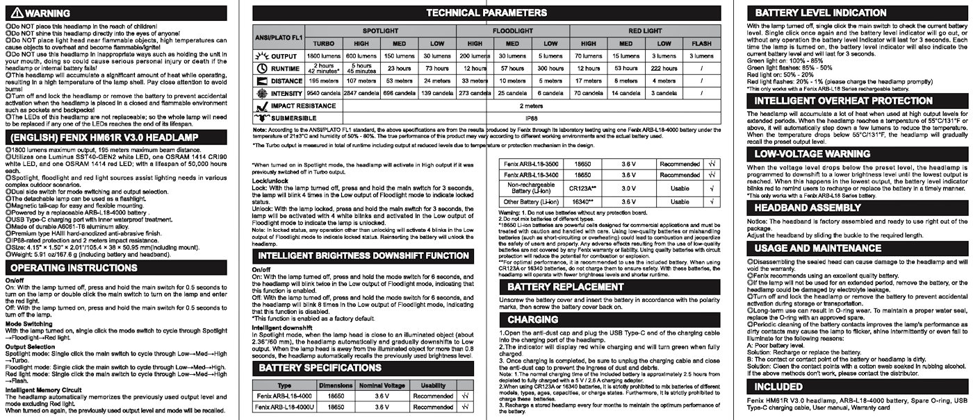 | Output/Runtime | White Light: Turbo: 1800 Lumens, (2 hrs 42 min), High: 600 Lumens, (5 hrs 45 min), Med: 150 Lumens, (23 hrs), Low: 30 Lumens, (73 hrs), Floodlight High: 200 Lumens (12 hrs), Med: 30 lumens (57 hrs), Low: 5 Lumens (300 hrs) Red Light: High: 70 Lumens (12 hrs), Med: 15 Lumens, (53 hrs), Low: 3 Lumens (222 hrs), Flash: 3 Lumens |