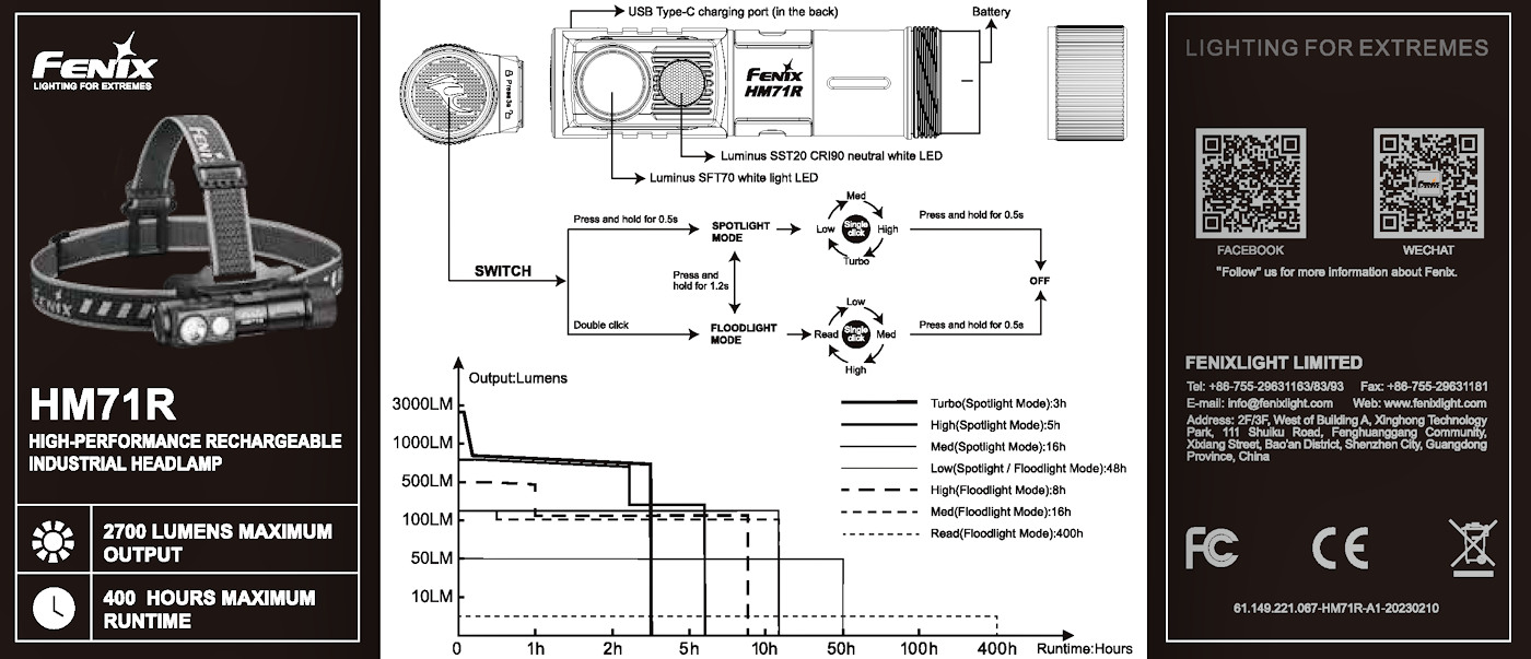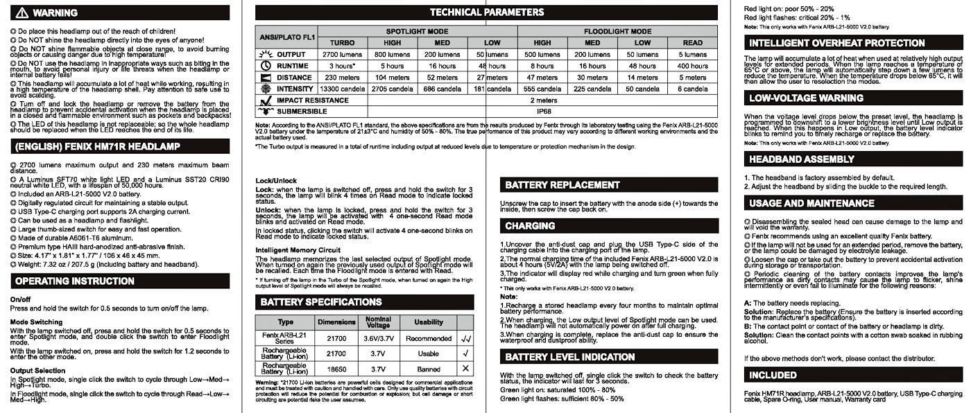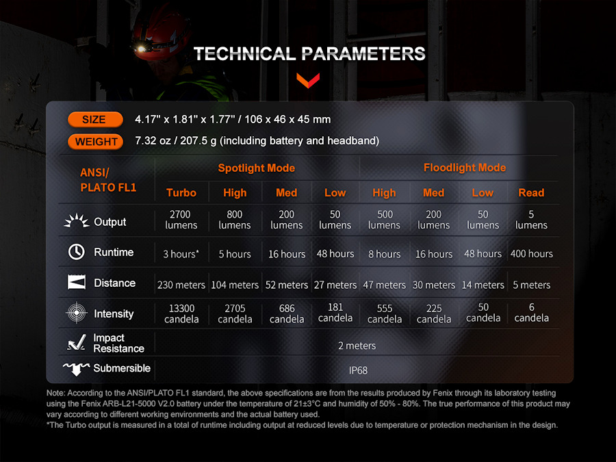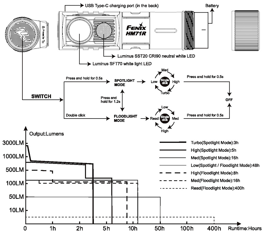 | Output/Runtime | Spotlight Mode Turbo: 2700 Lumens, (3hrs), High: 800 Lumens, (5hrs), Med: 200 Lumens, (16hrs), Low: 50 Lumens, (48hrs) Floodlight Mode High: 500 Lumens, (8hrs), Med: 200 Lumens, (16hrs), Low: 50 Lumens, (48hrs) Reading: 5 Lumens, (400hrs) |