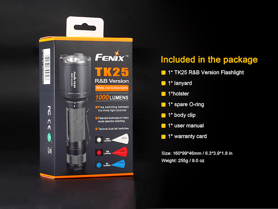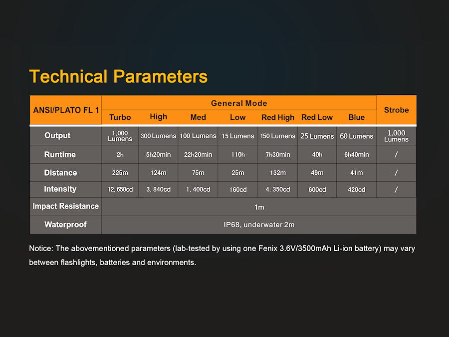 | Output/Runtime | Turbo: 1000 lumens (2 hrs), High: 300 lumens (5 hrs 20 mins), Med: 100 lumens (22 hrs 20 mins), Low: 15 lumens (110 hrs) Red High: 150 lumens (7 hrs 30 mins), Red Low: 25 lumens (40 hrs), Blue 60 lumens (6 hrs 40 mins), Strobe 1000 lumens |